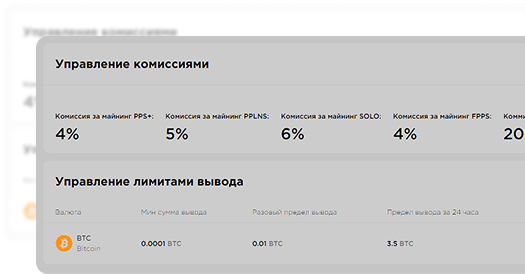 - Гибкая настройка комиссий для разных схем (PPS+, PPLNS, SOLO, FPPS)
