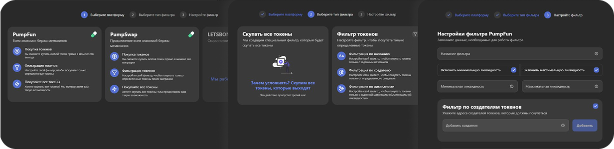 после чего задаются параметры вроде диапазона ликвидности, адресов создателей и прочее.