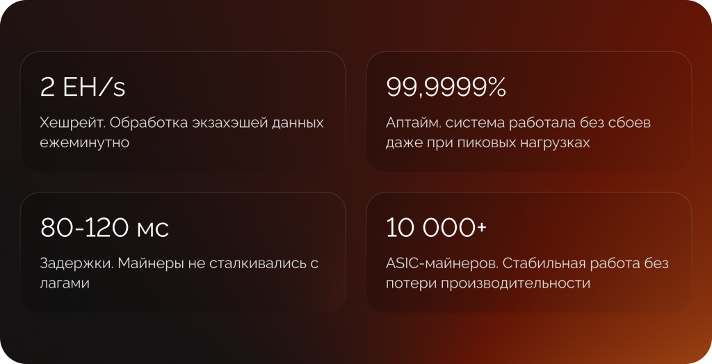 Результат первого месяца: пул обрабатывает 2 EH/s, держит 10,000+ подключений без деградации скорости, задержка сети 80-120 мс. Сегодня работает с промышленными дата-центрами и индивидуальными майнерами.